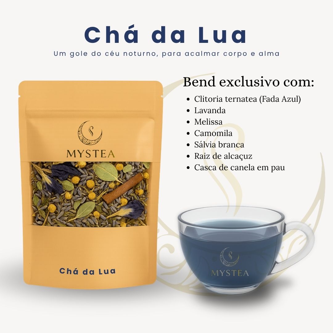 Feito com Clitoria ternatea (Blue Butterfly Pea / Fada Azul), lavanda, melissa, camomila, sálvia branca, raiz de alcaçuz e casca de canela em pau, este chá é muito mais do que uma bebida: é um ritual que conecta você à energia da lua e à calma do universo.